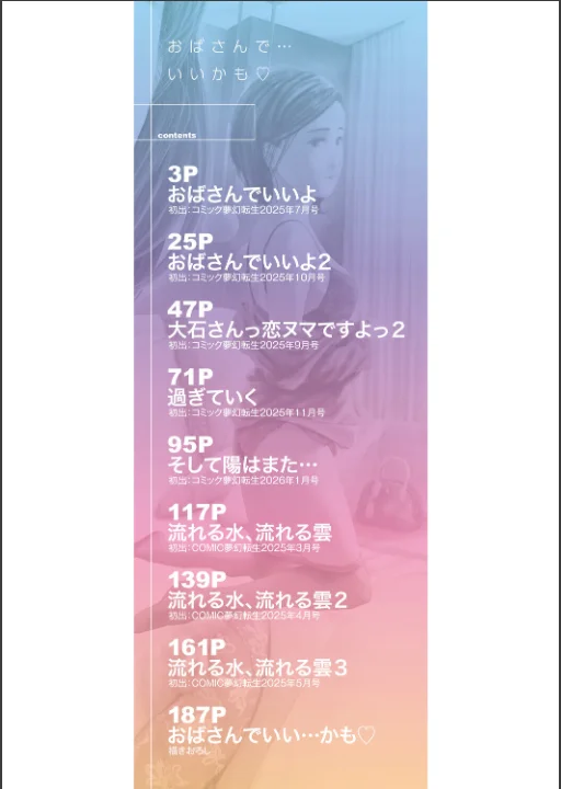 【第1話試し読み付き!!】〈息子の友達との逢瀬〉がワタシの‘女’を惹き起こす◆人妻・実花は息子の友人・陽介との小さな秘密を胸に、週末になるたび彼の肉体を求めてしまう。ふと触れた若い体温や耳元に落ちる息づかいが、実花の秘奥へ染み込み、眠っていた‘女の悦び’を浮かび上がらせていく。〈おばさんでいいよ〉◆同じマンションに越してきた青年・開斗とのささやかな会話が、弥生の胸の底に沈んでいた‘渇き’を揺らした!!性交中に強く首を絞められたコトで、弥生は未知のエクスタシーを得てしまい……。〈流れる水、流れる雲〉◆人生の半ばを越えたオンナたちが、思いがけず触れてしまった体温に頬を染め、ひと呼吸の揺らぎに心をほどいていく……。したたる欲とせつない情愛、その狭間で揺れる美熟女たち!!あさぎ龍が濃密に描き出す美熟女群像エロス!!若き肉棒の脈動! 潤む陰唇の蜜孔! 昂る悦楽の果てに二人は!!【収録作品】おばさんでいいよ〈全2話〉大石さんっ恋ヌマですよっ2過ぎていくそして陽はまた…流れる水、流れる雲〈全3話〉おばさんでいい…かも▽〈描き下ろし〉【特典】・書店配布用イラストペーパー・カラー表紙複製原画