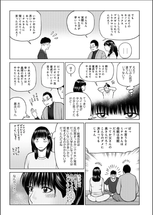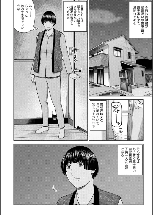 ディープキスと寝取りに定評がある黒木秀彦の最新作。欲求不満の妻たちがいかにして男をゲットするのかというテーマに貫かれている。息子の友達とエッチしてしまう「息子の友達が脅して来た」女上司が誘惑する「のみすぎチューイ」ヤンキー時代のリーダーの女が人妻になってた「復讐NTR1再会」そして勢いで二回戦「復讐NTR2別れのベロチュー」別れ際の玄関でする「復讐NTR3危険なセフレ」なんでも屋にエアコン清掃を依頼したら昔なじみの男の子だった「ムチムチ豊満妻と大学生」奥さんに迫られて二回戦「ムチムチ豊満妻と大学生後編なんでも屋はつらい」叔父さんの奥さんに自慰行為を見せつけられる「誘う叔母オレ童貞なんですけど?」エレベーターの中で人妻と閉じ込められる「エレベーターパニック」義理の息子のトラウマなおす手伝いをする「セックスカウンセリング前編トラウマ」息子と結ばれてしまう「セックスカウンセリング後編メンタルケア。あとがきショート漫画。奥付。付録はX投稿画像と表紙裏表紙原画そして漫画「イニシアティブ」「イニシアティブ後編」「言ってみるもんだ」