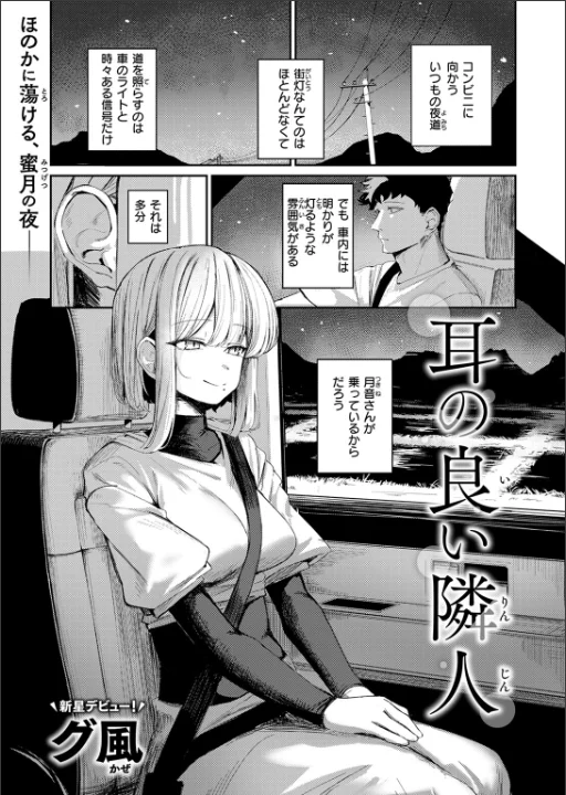 「…ふたりで 良い夜にしましょう…?」アパートの隣人で、夜中近所のコンビニで鉢合わせてはとりとめのない会話をする仲の月音(つきね)さん。最近は、月音さんの車の調子があまりよくないことから、自分の車で一緒にコンビニに行く関係へと発展。だけど今夜は、どこか含みのある言い方でなにかと自分を翻弄してくる助手席の月音さん。帰宅後、一旦落ち着こうと買ってきたものに目をやると、月音さんのものと思わしき鍵が入っていた。直接届けてほしいという月音さんへ、届けに部屋に入ると彼女が突然キスしてきて――