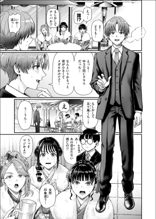 成人式のガールズトークで冴えない近況を語り合う女子3名。今日彼氏つくっちゃえば〜? なんて軽口を叩いていると見知らぬイケメンに声を掛けられる。ナンパ……ではなくて、それはかつてのクラスメイト・五十嵐(いがらし)の変貌した姿だった!!ぼっち陰キャだった過去から友達が居ないという彼。これをチャンスと目くばせして4人で一緒に行動することに。――超イケメンなのにウブで可愛い奇跡の内面を両立する五十嵐くんが、式典中にW手コキされちゃったり、式後に見せオナ(フェラ付き)させられたり、夜の同窓会のあとは…おたのしみの時間だったり……!?振袖×複数×ぐりえるもワールドで魅せる一生モン性人式メモリー。